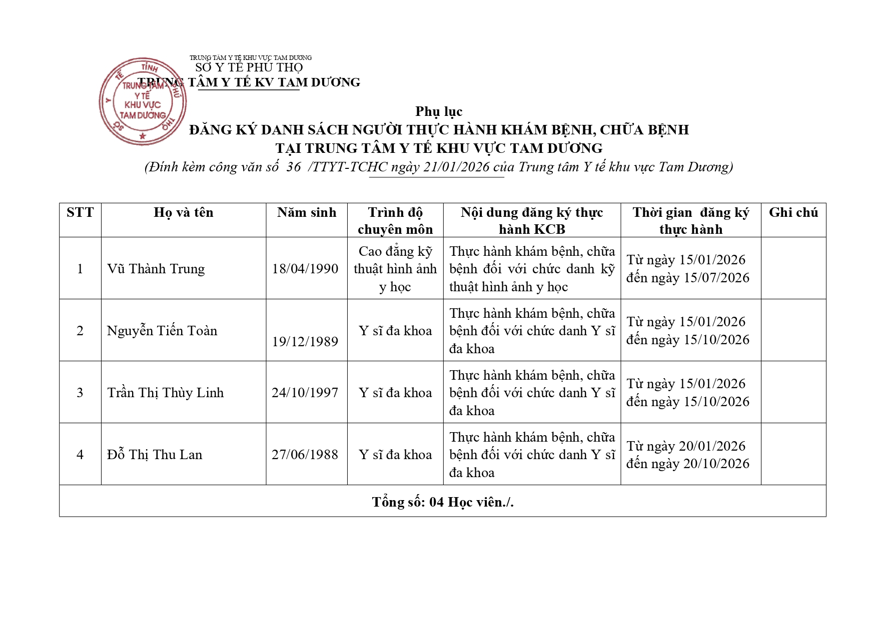 Danh sách người thực hành đã hoàn thành quá trình thực hành khám bệnh, chữa bệnh 05/01/2026